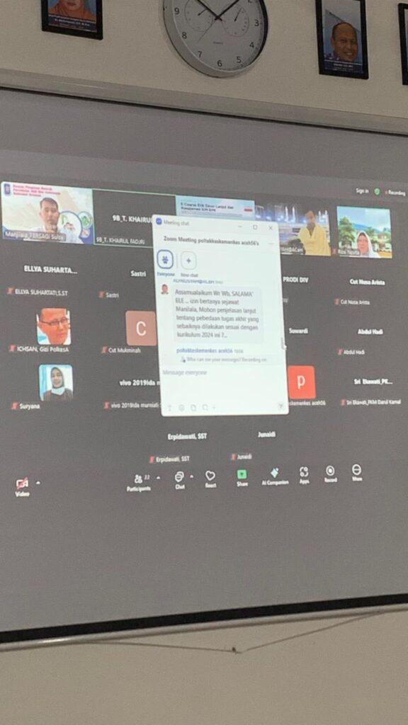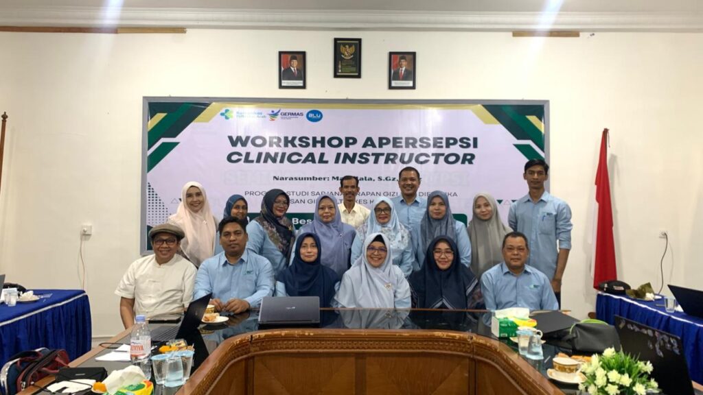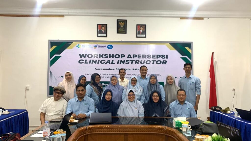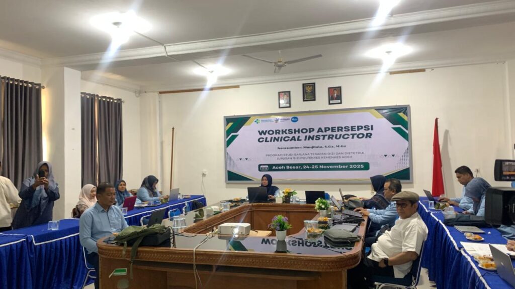 Aceh Besar, 24 November 2025 bertempat di Ruang Poorwo Soedarmo dilaksanakan kegiatan Workshop Apersepsi Clinical Instructure Prodi Sarjana Terapan Gizi dan Dietetika Jurusan Gizi Poltekkes Kemenkes Aceh Tahun 2025, yang diikuti oleh Ketua Jurusan Gizi, Ketua Program Studi D-III Gizi, Ketua Prodi Sarjana Terapan Gizi dan Dietetika, Sekretaris Jurusan Gizi, dosen, tenaga kependidikan dan stakeholder yang berasal dari PKM dalam wilayah kerja Provinsi Aceh yang berlangsung  secara hybrid (Daring dan Luring).